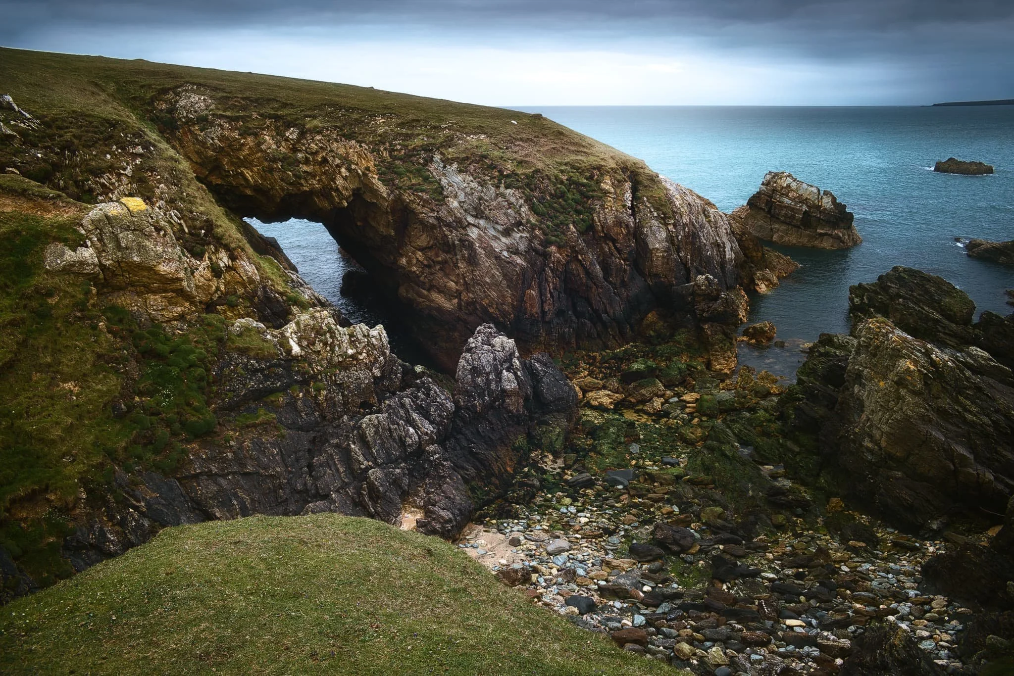 From the edge of the crag I got low to emphasise the amazing geology as a compositional aid towards the cliffs of Aberport. Even on a gloomy day, the waters here were still a beautiful azure.