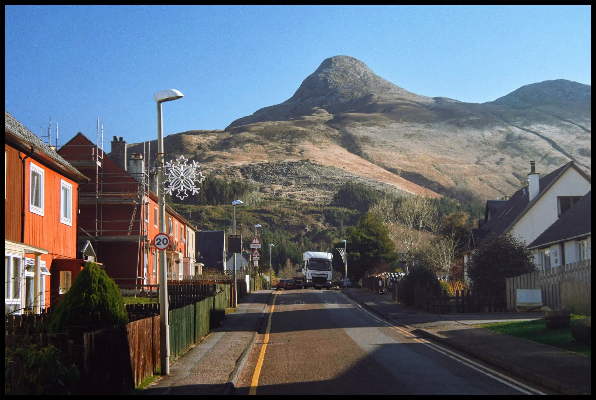 The route leaves the railway station via the woodland beneath it, and starts climbing back up the mountainside towards the viaduct. Here, Beinn an Tuim (810m/2,657ft) was catching a slither of morning winter light.