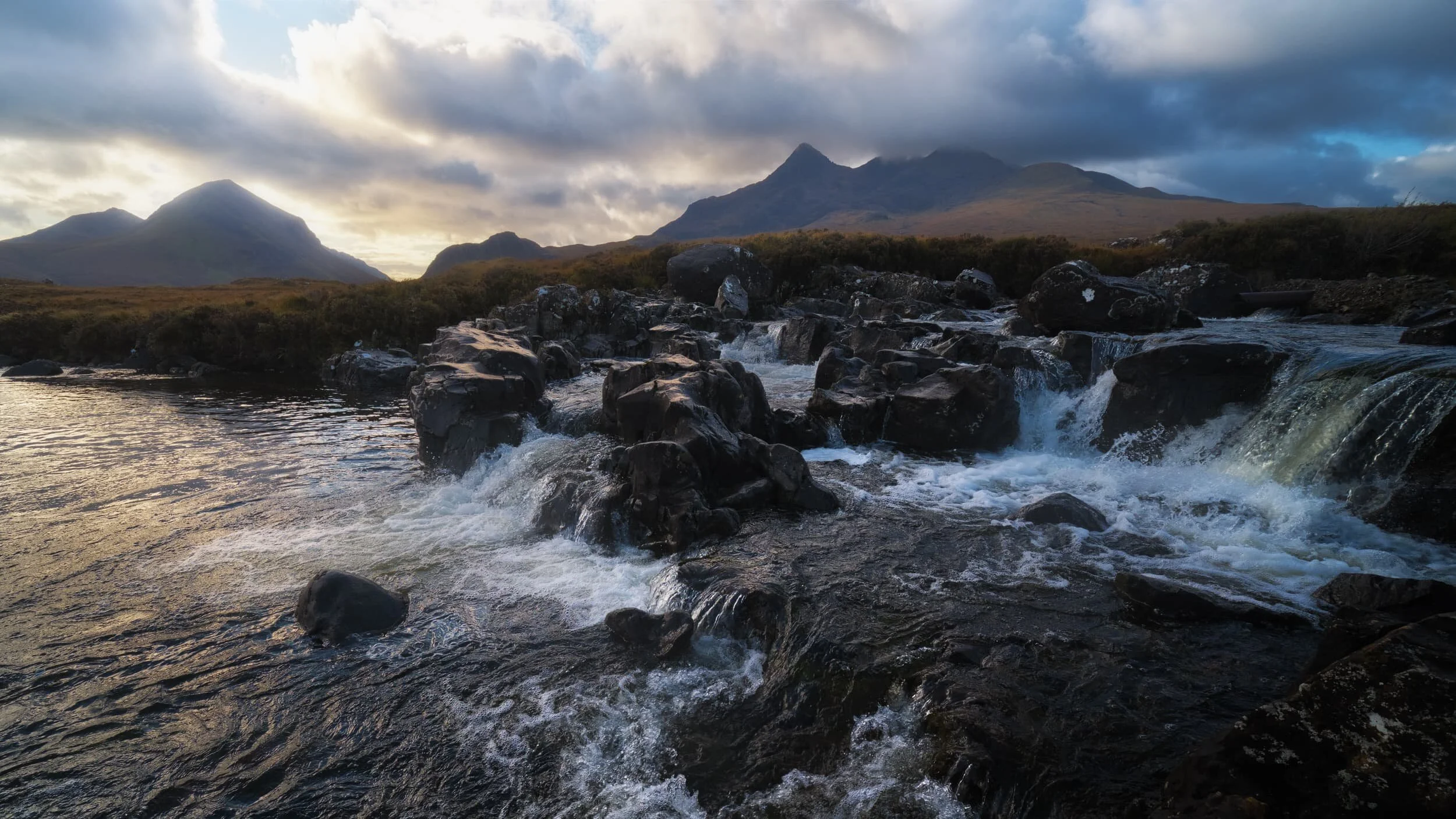 At Sligachan one is offered an incredible view of the northern jagged peaks of the Black Cuillins mountain range, particularly the peaks named Sgùrr nan Gilean (966 m/3,170 ft) and Sgùrr a’ Bhàsteir (900 m/2, 953 ft). Every time I’ve been to Skye I’ve tried navigating the various rivers and becks that stream off the northern faces of the Black Cuillins, looking for compositions.